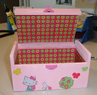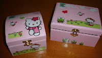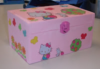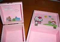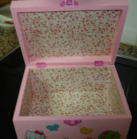 Caixa de madeira pintada em tons de rosa, com motivos da Hello Kitty. Com aproximadamente 17 x 12 x 12 cm.