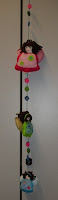 Mobile de anjinhas (eu sei que os anjos não têm sexo, mas estas tem cara de menina) muito coloridas, de feltro, carinhas pintadas pela minha amiga e comadre Carla que tem um jeito enorme, com tinta de tecido, com aplicações de flores em madeira
