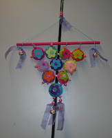 Espanta Espiritos em feltro com aplicação de lantejoulas, fitas de organza e guizos