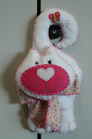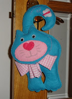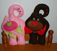 Estes são os Gatos de maçaneta com aproximadamente 30 cm de comprimento, de feltro com aplicações de lantejoulas, peras e fimo
