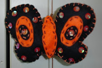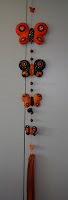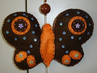 Mobile de borboletas em feltro, tons laranja, castanho e azul, com aplicações de lantejoulas, bolas e borboletas de acrilico e fitas de organza