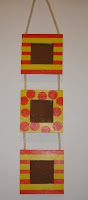 Moldura tripla em madeira totalmente feita por mim, pintada a laranja e amarelo, com riscas e bolas, com corda entre cada moldura