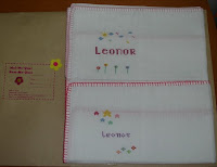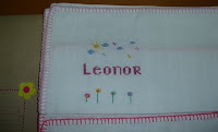 Fraldas Bordadas a Ponto de Cruz, personalizadas com o nome Leonor, picó à volta em croché.