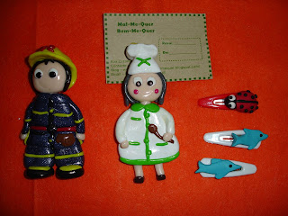 Bem e hoje deixo-vos com as Pregadeiras de fimo do Srº Bombeiro, e da Srª Cozinheira e uns ganchinhos com golfinhos e com uma joaninha também de fimo, acabamento envernizado.